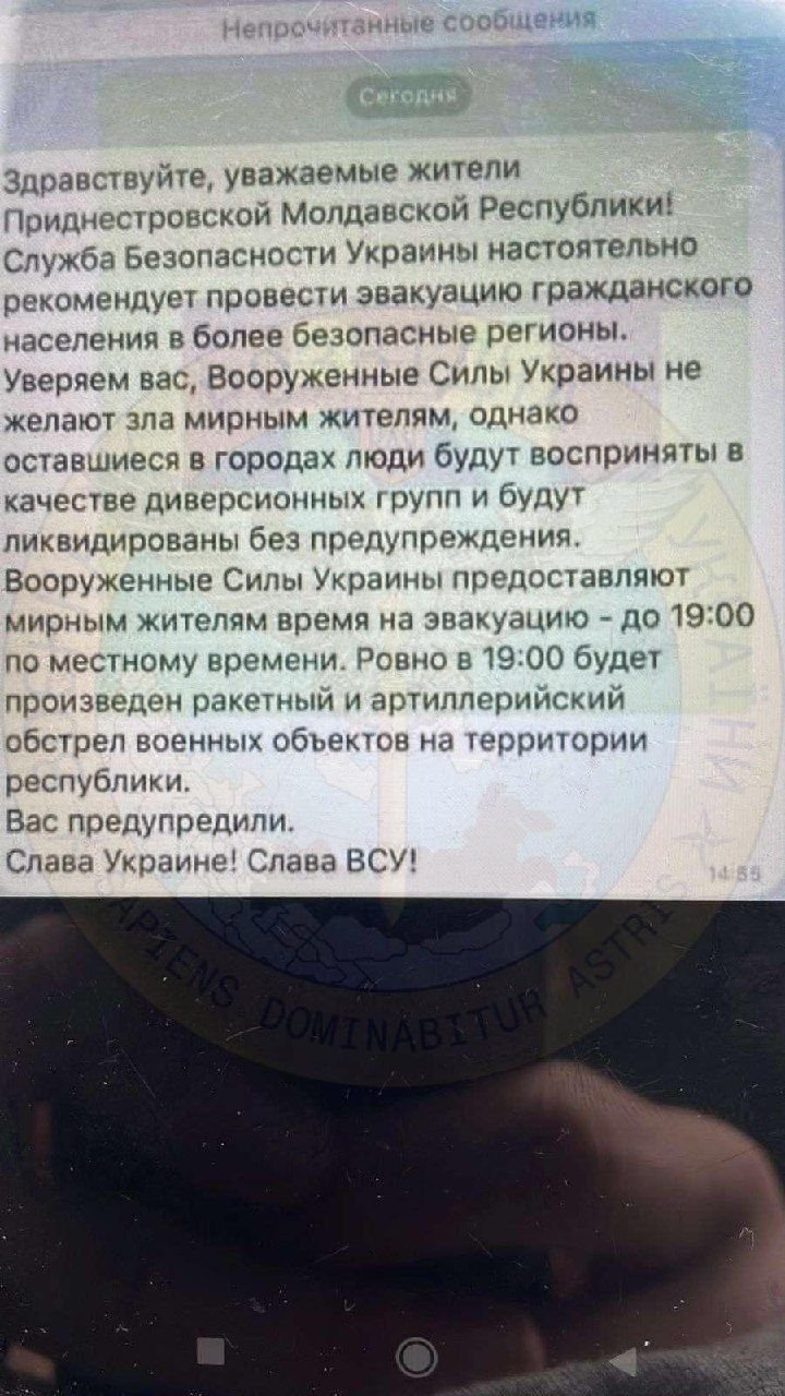 Жителі невизнаної «Придністровської молдавської республіки» отримують СМС, нібито від імені Збройних сил та спецслужб України. У них міститься попередження про «ракетний та артилерійський» удар по території «ПМР». Це чергова провокація російських спецслужб проти України та Молдови.