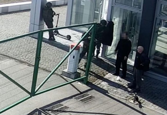 На відеозаписі зафіксовані п'ятеро російських солдатів, які намагаються проникнути в приміщення автосалону, стріляючи по замках і розбиваючи шибки.