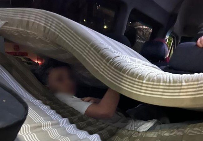 Молодий чоловік сховався у багажному відділенні мікроавтобуса, занурившись між сумками та валізами, прикрившись смугастим матрацом.