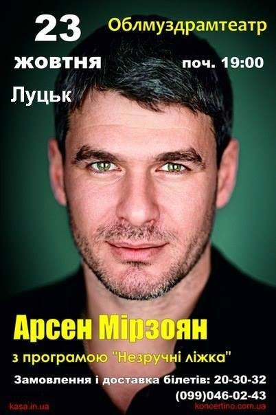 "Луцьк! Маємо для вас приємний сюрприз! 23 жовтня місто з сольним концертом відвідає Арсен Мірзоян! Концерт відбудеться у місцевому Облмуздрамтеатрі, початок о 19:00. Всі відомості щодо квитків за телефонами: 20-30-32 та (099) 046 02 43", - йдеться в повідомленні.
