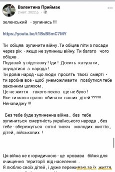 Жінка не просто поширювала ці матеріали, а й звинувачувала у війні чинну владу. Мовляв, президент Зеленський не хоче домовлятися про мир, натомість просить зброї. Більше того, на її думку, ця війна – договірна.