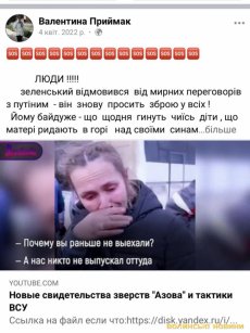 Серед відео, які є на сторінці у жінки, фігурують «викривальні» матеріали про начебто «звірства» полку «Азов» та ЗСУ.