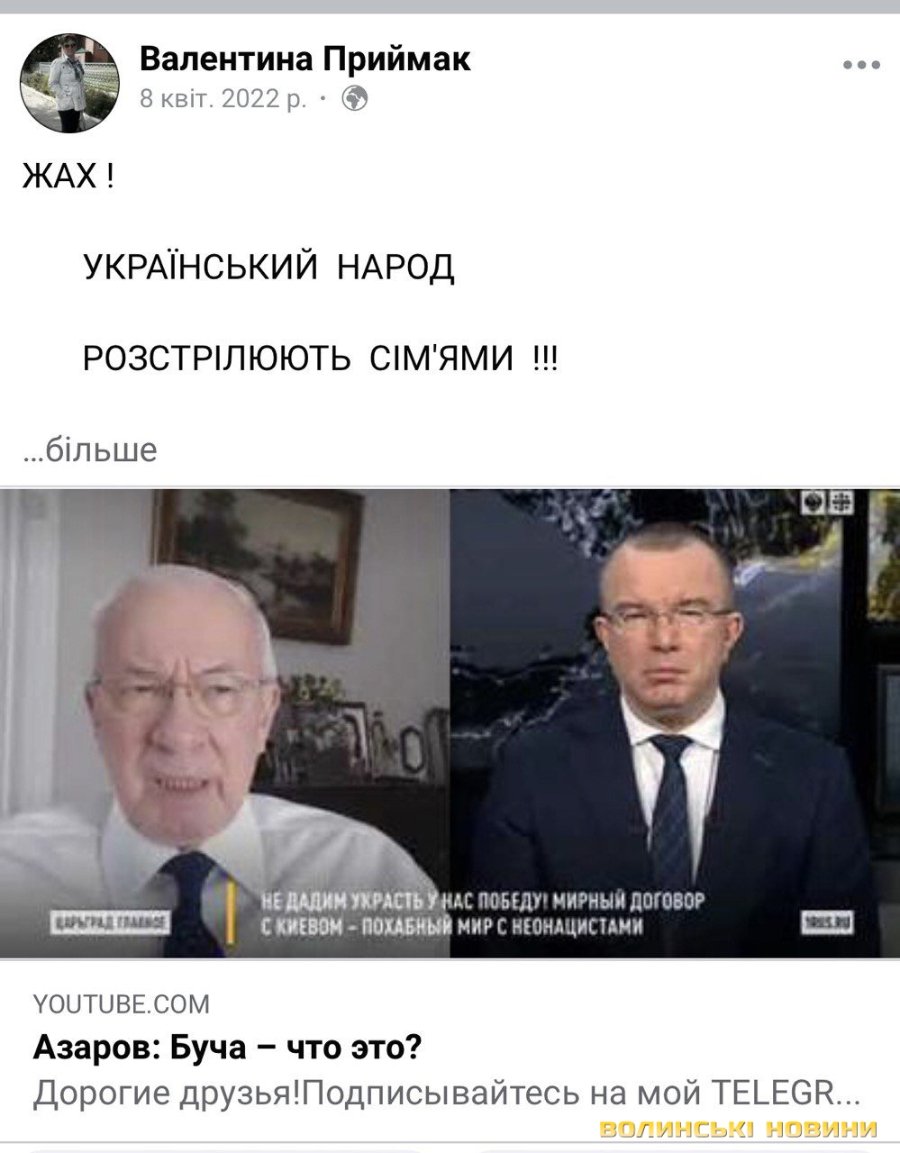 За інформацією джерел, нею виявилася Валентина Приймак з Каменя-Каширського. Її фейсбук-сторінка просто кишить «викривальними матеріалами». Серед них – інтерв’ю втікача, колишнього прем’єр-міністра уряду Януковича Миколи Азарова, пропагандистські ролики російських каналів та псевдостатті про теорії змови.