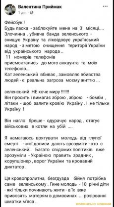 «Кат зеленський вбиває , замовляє вбивства людей - є реальна загроза моєму життю ... зеленський НЕ хоче миру !!!!!!!Він просить і вимагає зброю , зброю - бомби , літаки - щоб залити кров'ю Україну...» – йдеться в одному з постів волинянки.