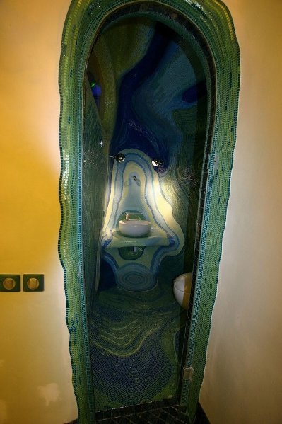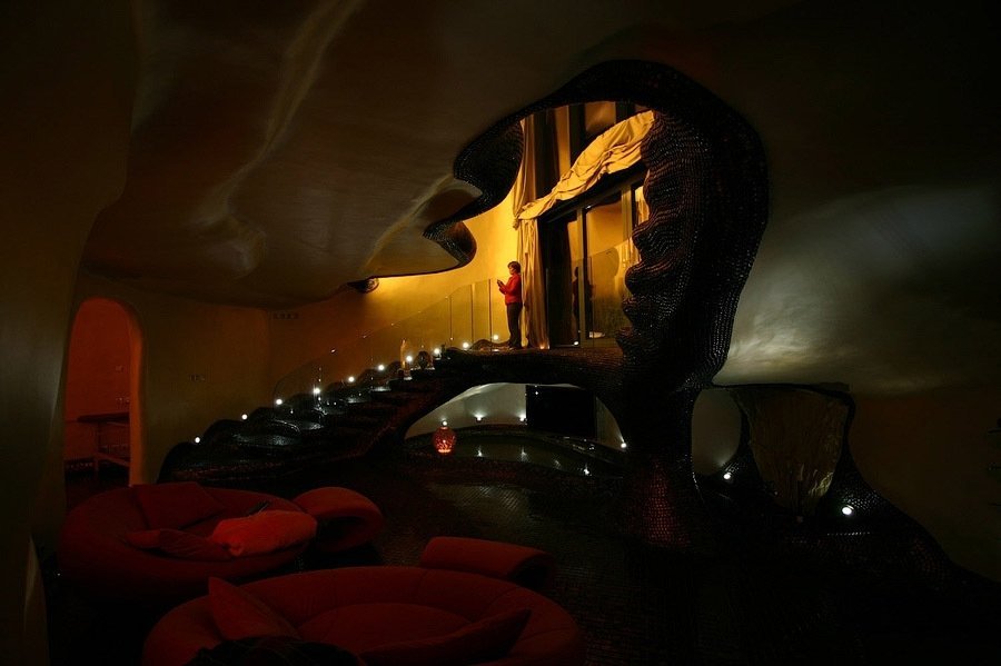 Крім незвичайної форми, будівля дивує і своїм інтер’єром, в якому відсутні звичні прямі кути і лінії. Світло в будинок потрапляє через вікна-виступи нагорі черепашки і величезний вітраж в стіні. У будинку три поверхи.