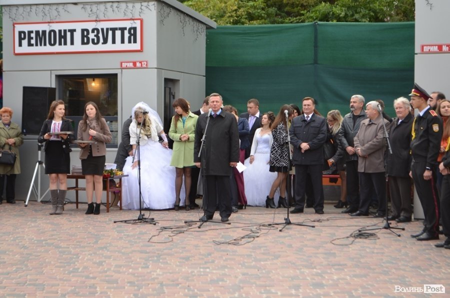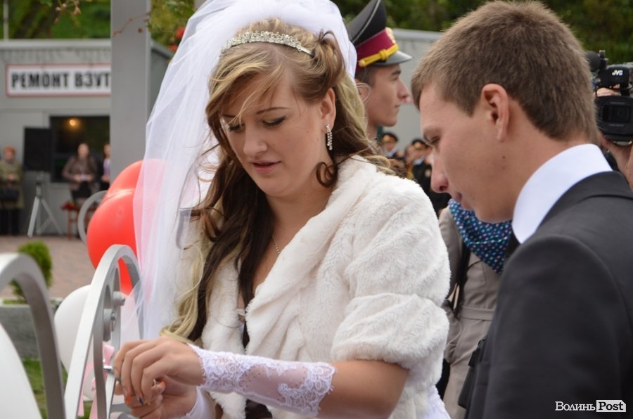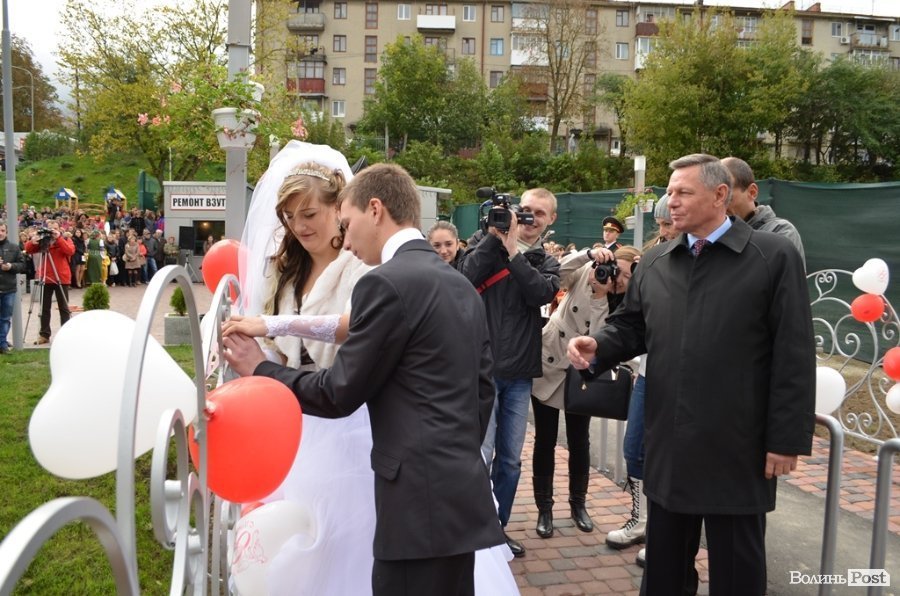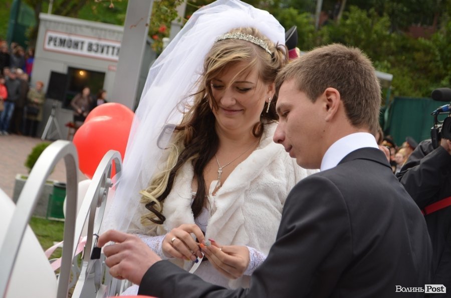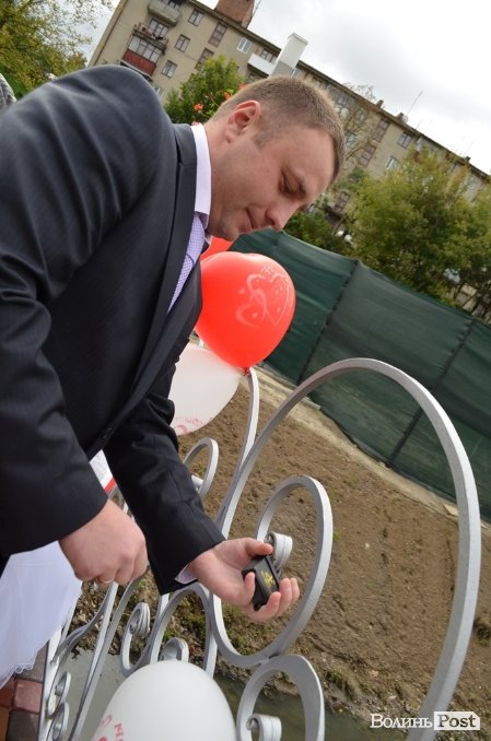 Молодята долучилися й до вже традиції вішати на міст замки кохання, ключі від яких вручили Миколі Романюку, який викинув їх у річку. «Щоб ніхто не знайшов», – пояснив мер Луцька.