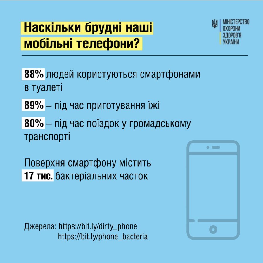 Поверхня мобільного телефону в середньому містить 17 тисяч часточок бактерій, що в рази більше ніж на сидінні унітаза. Тому смартфони потрібно регулярно протирати та дезінфікувати.