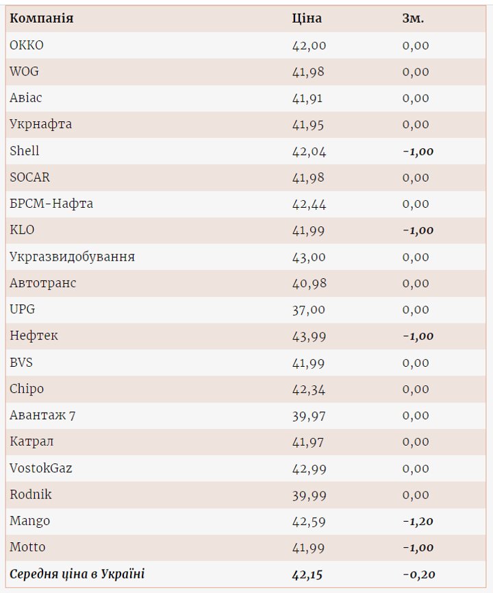 Пережа Shell також знизила вартість продукту на 1 грн/л, до 42,04 грн/л. На 1,00 грн/л і 1,2 грн/л, до 41,99 грн/л і 42,59 грн/л знизили ціни Motto і Mango відповідно.