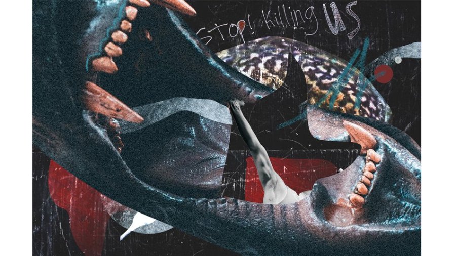 "Робота про те, що я відчувала у перший день війни. Тут рука чоловіча. Цей чоловік знаходиться в пащі великого звіра, але він продовжує боротись за своє життя, і він цю пащу розриває. Коли він її повністю розірве, то вийде переможцем", – розповіла колажистка.
