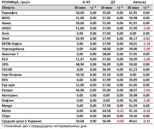 Роздрібні ціни на бензин в Україні 30 червня 2022 року порівняно з попереднім торговим днем не змінилися. Автогаз і дизельне паливо подешевшали.