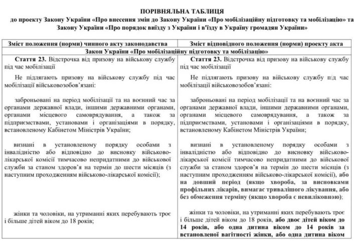 Так, на відміну від документа його колег, він виступає за суттєве розширення переліку чоловіків, яким можна залишати межі України. Нагадаємо, що за чинно нормою, не підлягають призову на військову службу жінки й чоловіки, на утриманні яких перебувають троє і більше дітей віком до 18 років.
