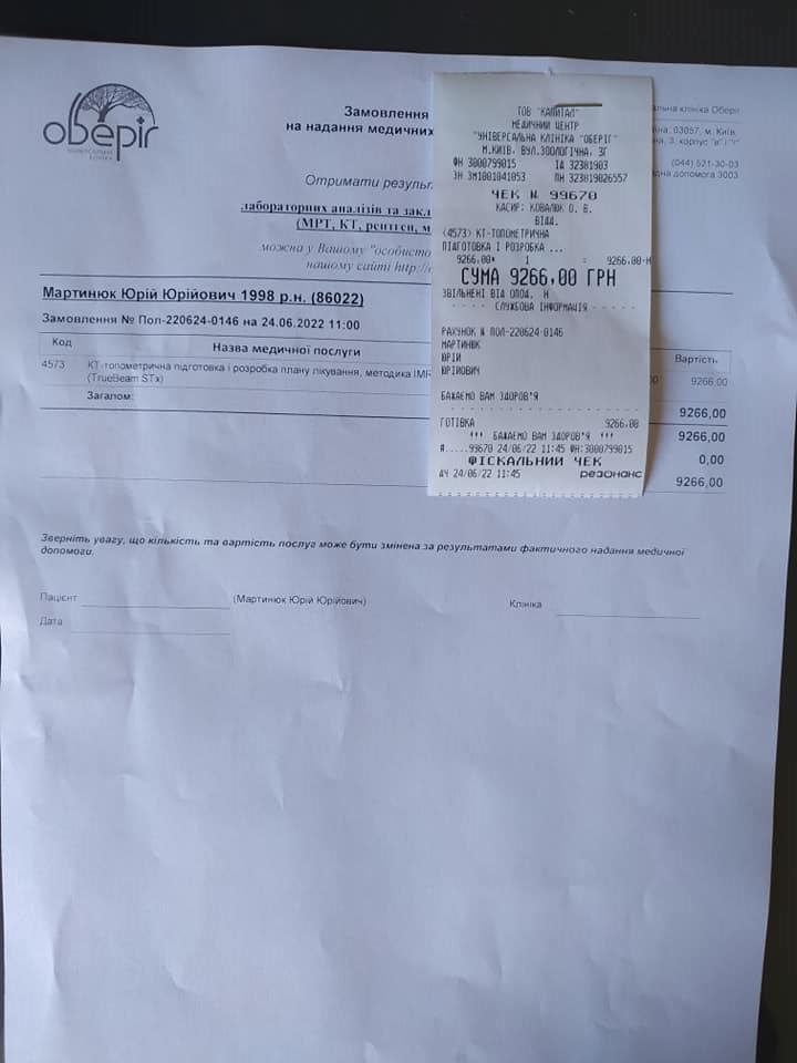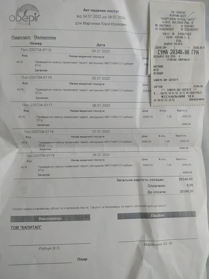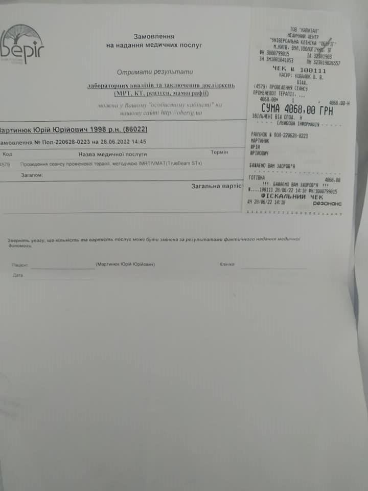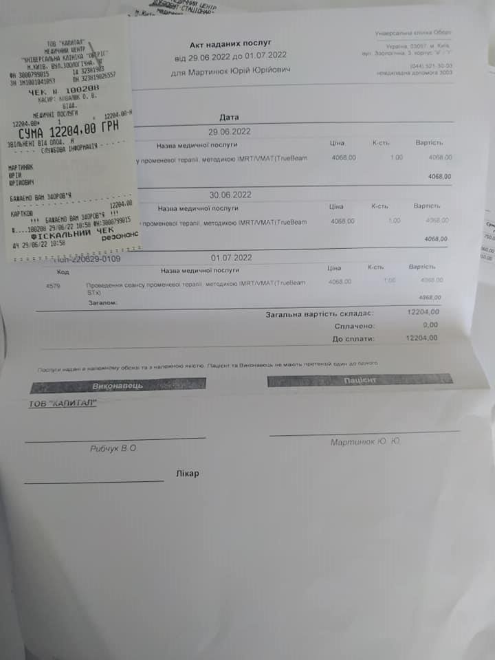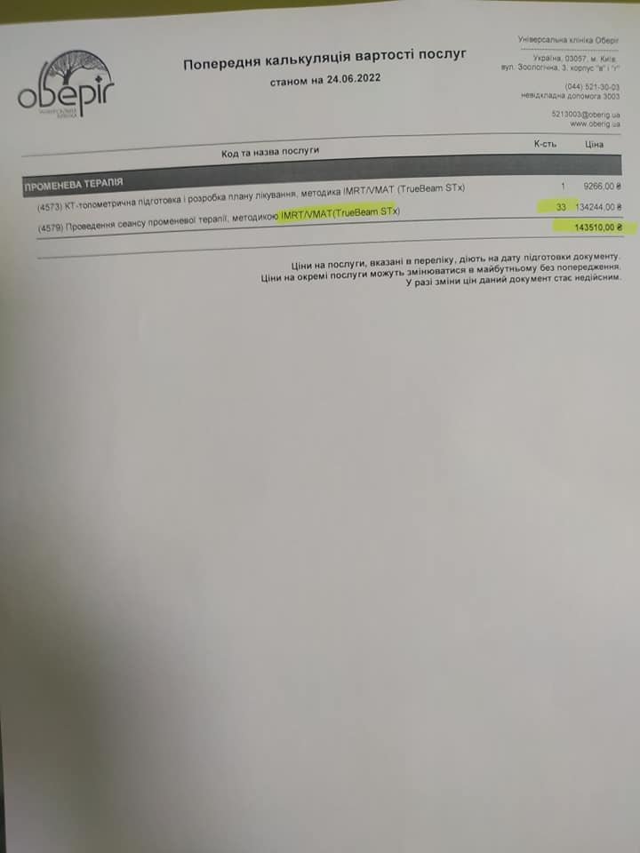 "Розумію що і ситуація в країні не проста,і для багатьох це складно. Ми наразі в Києві. Так як ситуація не проста, потрібно пройти опромінення на апараті який як найменше буде травмувати здорові тканини. Це все платно. В межах +- 150 000.