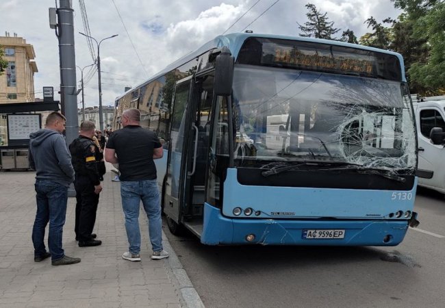 Водій автобуса №10 Василь Ротмислович розповів, що його транспорт виїхав на тротуар через зіткнення з іншим автобусом.