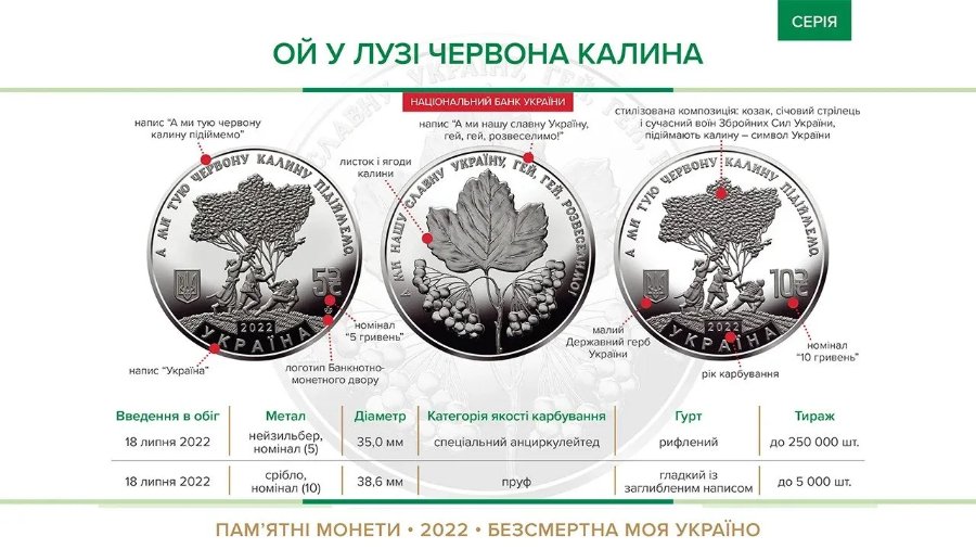Монети "Ой у лузі червона калина" входячи до нової серії НБУ "Безсмертна моє Україна". Їхній дизайн розробив київський художник Дмитро Кривоніс.