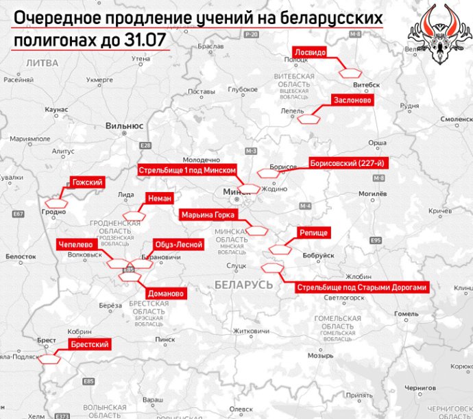 За інформацією "Беларускі Гаюна", з кінця квітня у Білорусі продовжували військові навчання "на тиждень" вже 13 разів. Очікувані дати завершення навчання на полігонах: