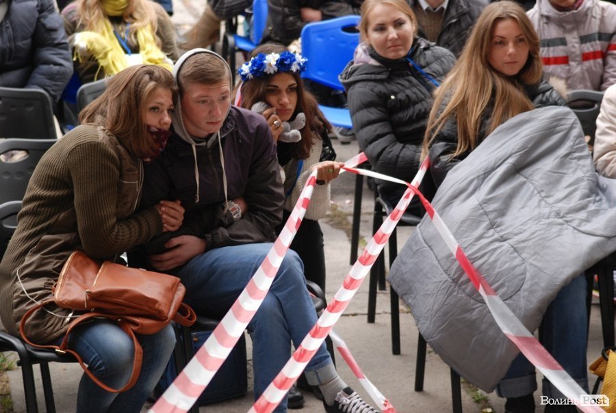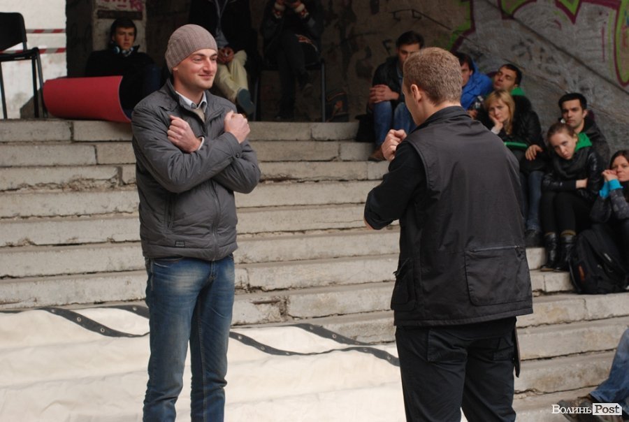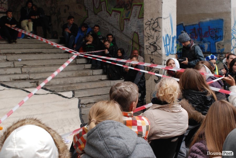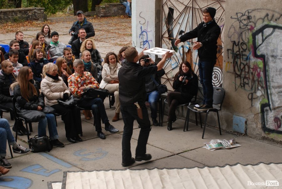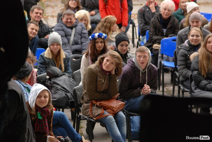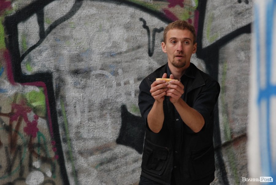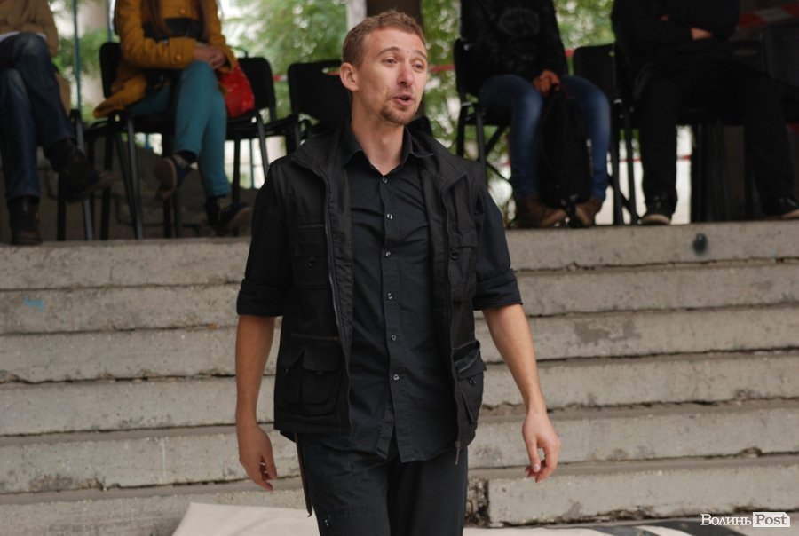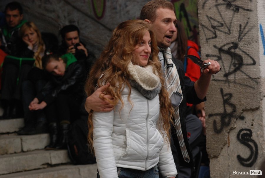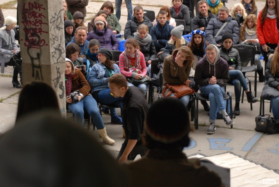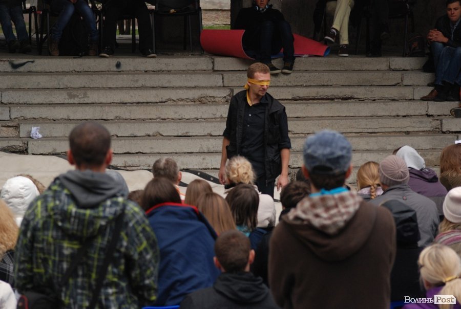 Власне це була моновистава, бо на сцені, яку облаштували на сходах справа від входу в Палац учнівської молоді, був один актор, але за час імпрези від залучив до дійства кільканадцять глядачів.