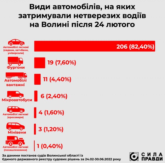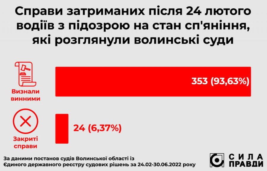 Загалом від початку війни, з 24 лютого до 30 червня, волинські суди розглянули 377 справ щодо водіння у нетверезому стані. Із них у 353 (93,63%) справах порушників визнали винними, а 24 справи закрили.