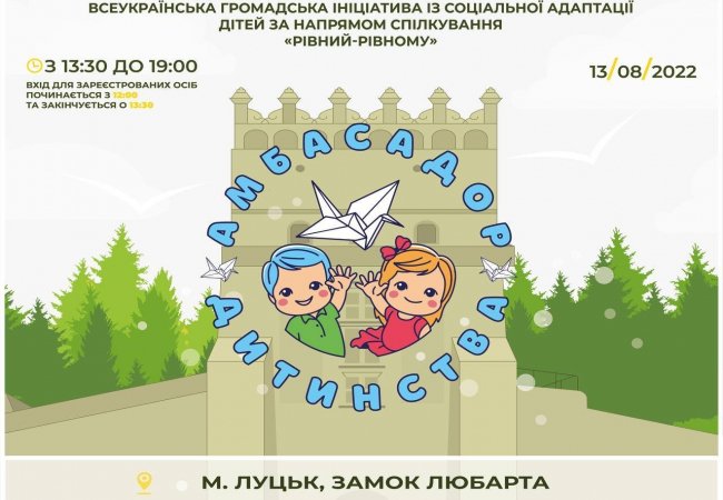 «Амбасадор дитинства» – це Всеукраїнська громадська ініціатива із соціальної адаптації дітей за напрямом спілкування «рівний-рівному». Захід відбувається за ініціативи голови Хмельницької ОВА Гамалія Сергія В’ячеславовича, за сприяння Волинської ОВА та за підтримки Луцької міської ради.