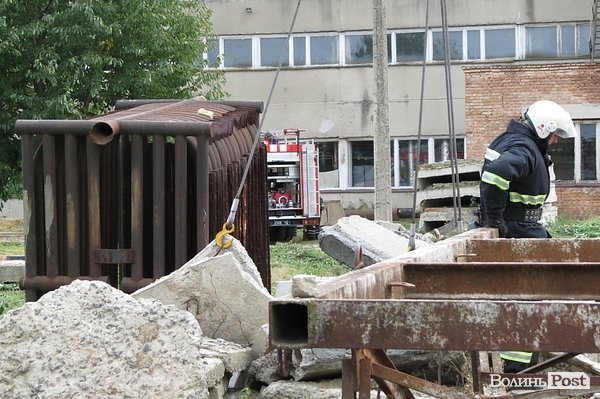 У дворі котельні рятувальники відпрацьовували порятунок людини з-під завалів. На місце надзвичайної ситуації прибув кран, який піднімав плити, з-під яких визволяли постраждалого.