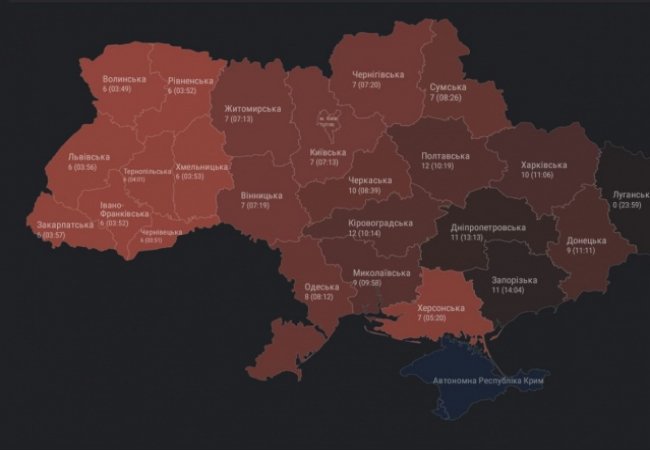 За тривалістю найдовші тривоги були у Запорізькій (14 годин), Дніпропетровській (13 годин) та Харківській (11 годин) областях. У Луганській області повітряна тривога без упину.