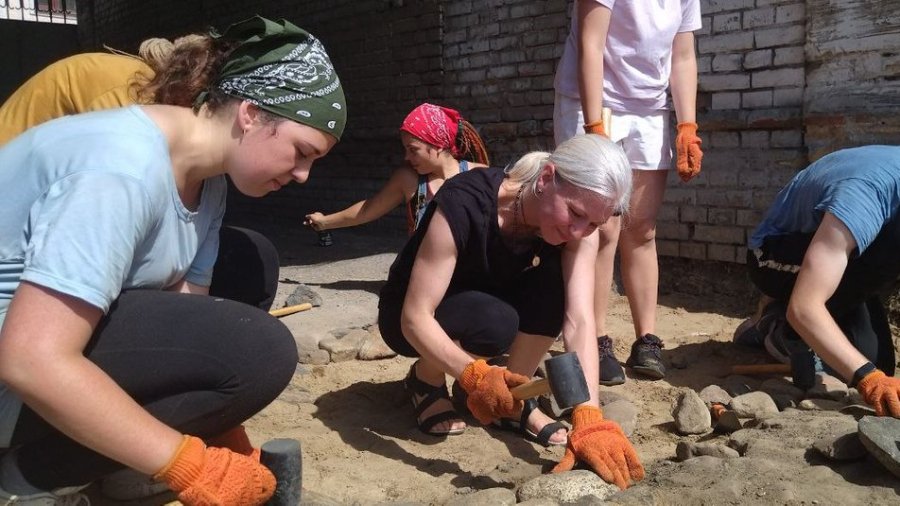 Усі роботи проводять волонтери. Переважно – це студенти з різних областей України. З 19-го по 29 серпня тут триває урбаністичний табір. Каже, що вперше у своєму житті перекладає кам'яну кладку Вікторія Лукащук, студентка із Коломиї. Дівчина вчиться на факультеті культурології.