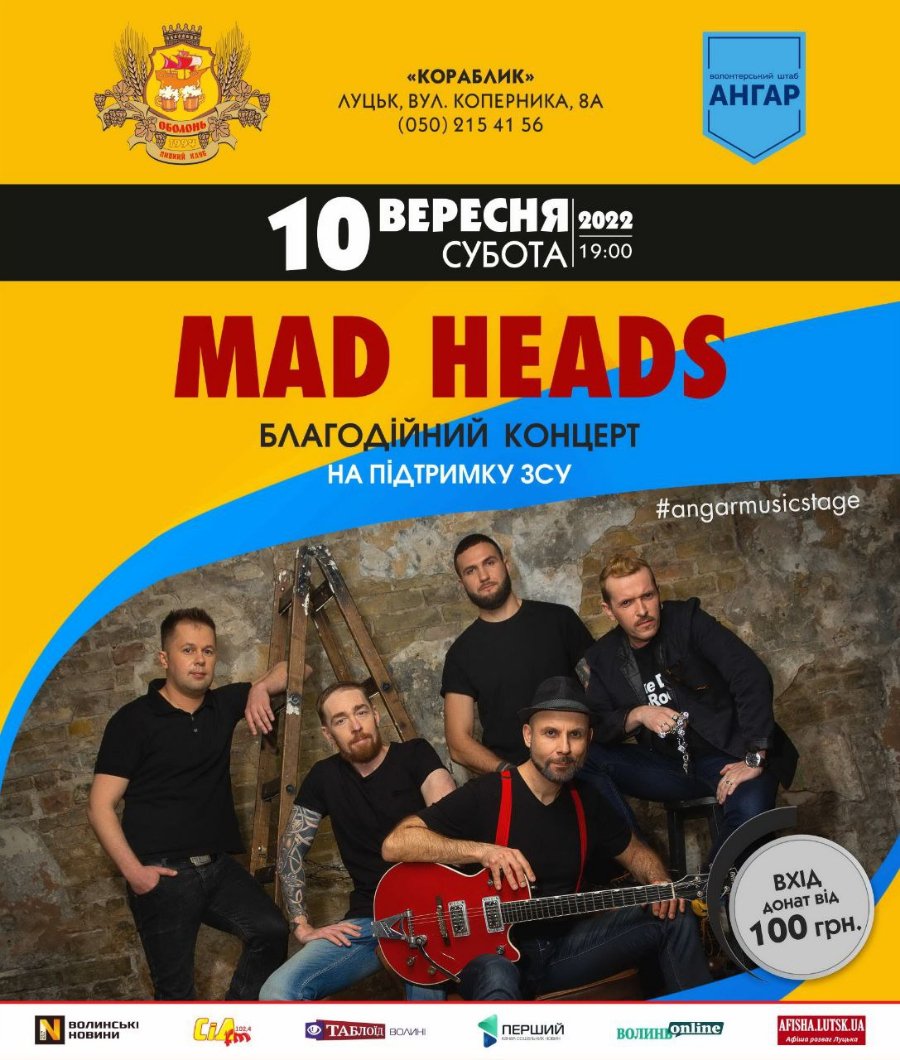 Також о 19:00 у пивному клубі «Кораблик-Оболонь» виступить гурт MAD HEADS. Вхід - донат 100 грн для волонтерського штабу АНГАР.
