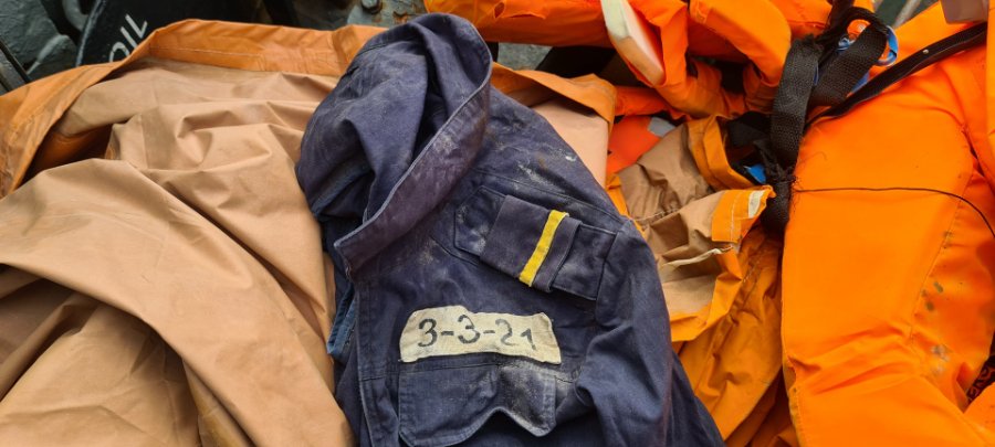 На плоту було зламане, пошкоджене корозією весло, балони для підкачування повітря. Також там був водонепроникний мішок, в якому знаходилися російські монети, елементи одностроїв моряків та морпіхів. На жилетах та одностроях були бойові номери.