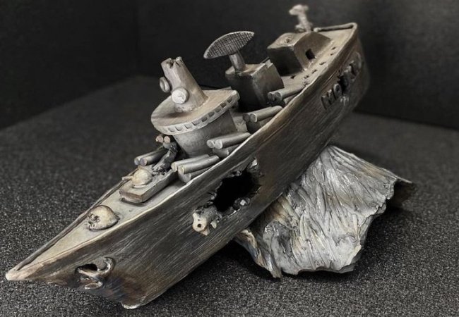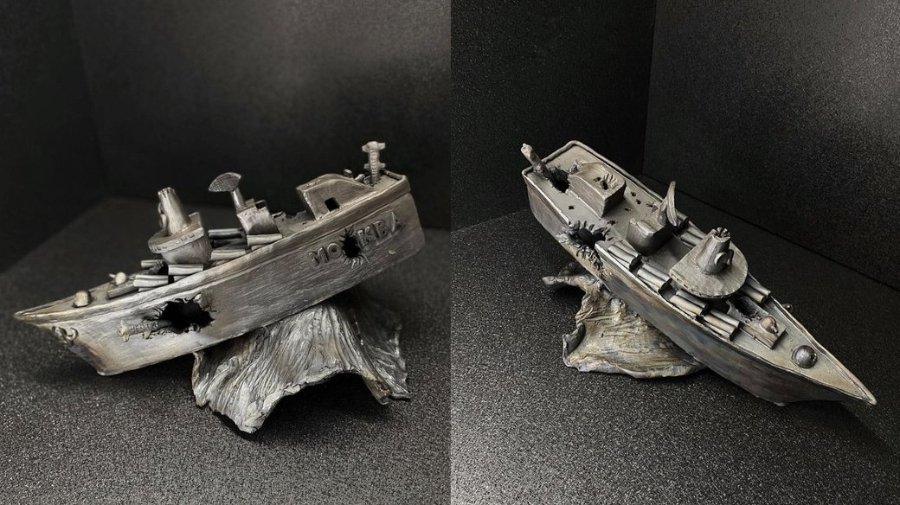 На змайстрованому з глини кораблі також видніються дві українські протикорабельні ракети "Нептун", які завдали судну пошкоджень, як це й сталося 13 квітня цього року.