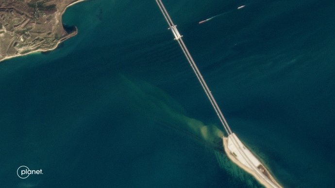"Ця пара зображень PlanetScope, зроблених 7 і 8 жовтня 2022 року, показує пошкоджений міст через Керченську протоку після потужного вибуху сьогодні".