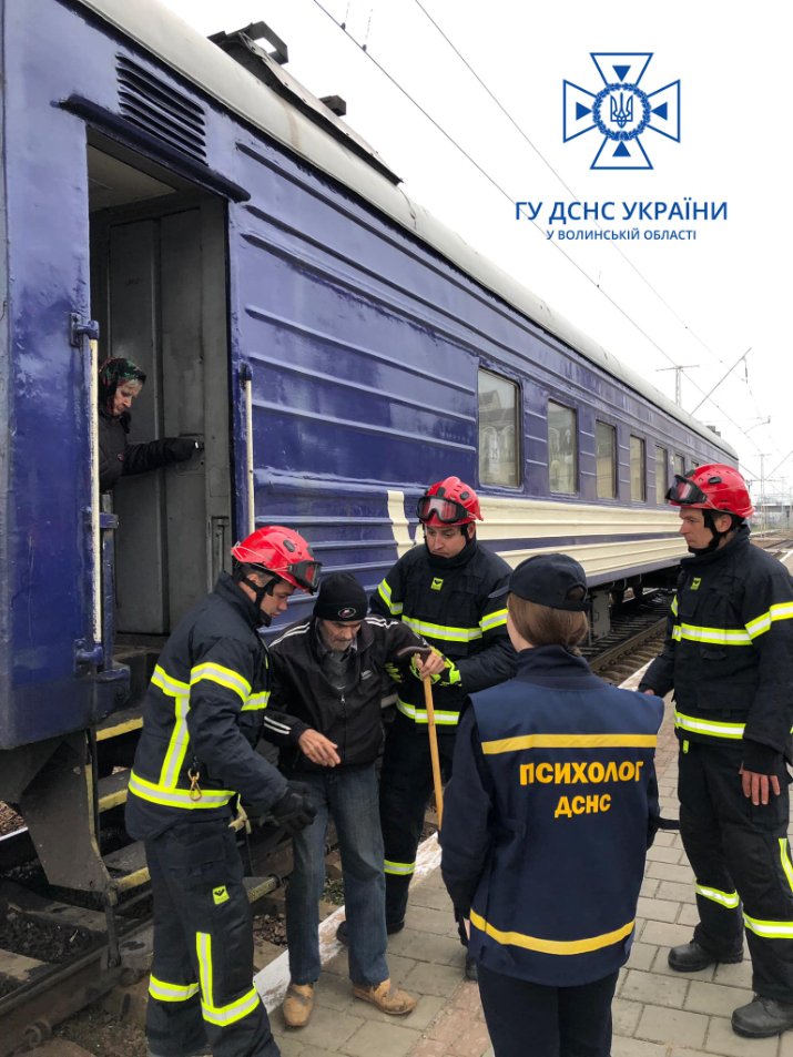 Співробітники аварійно-рятувальної частини спецпризначення допомогли громадянам похилого віку, в тому числі п’ятьом людям на візках, зійти з потягу та дістатись автобусу ДСНС.