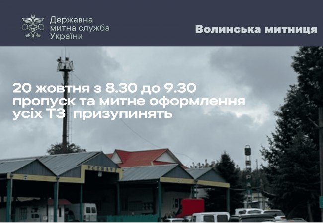 20 жовтня пропуск та митне оформлення усіх транспортних засобів, які планують перетин державного кордону через "Устилуг-Зосін", буде призупинене на годину.