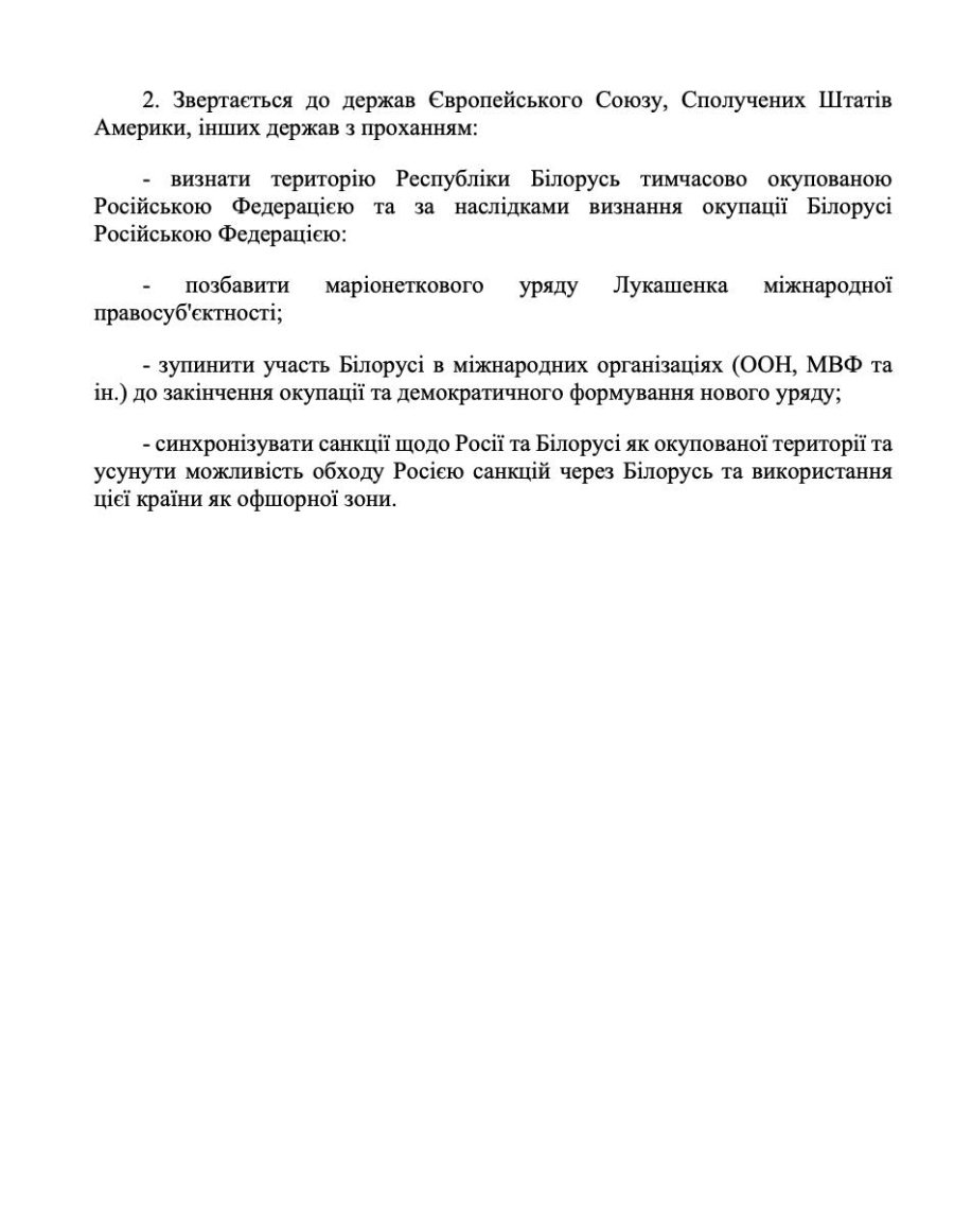 Депутати звертаються до міжнародного співтовариства з проханням визнати територію Білорусі тимчасово окупованою Росією, а також позбавити уряд Лукашенка міжнародної правосуб'єктності. Це означає припинення участі Білорусі в міжнародних організаціях, таких як ООН.