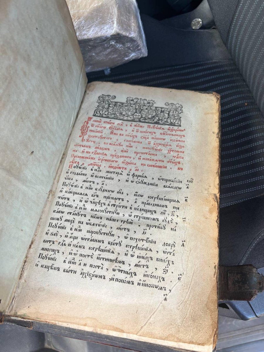 Волинські митники на посту "Устилуг" виявили в автомобілі пенсіонера, що виїжджав за кордон, старовинну книгу "Євангеліє учительне". Воно було дбайливо загорнуте у рушник та вкладене у картонну коробку. Зі слів громадянина, ця книга є родинною реліквією та перейшла йому у спадок від матері.