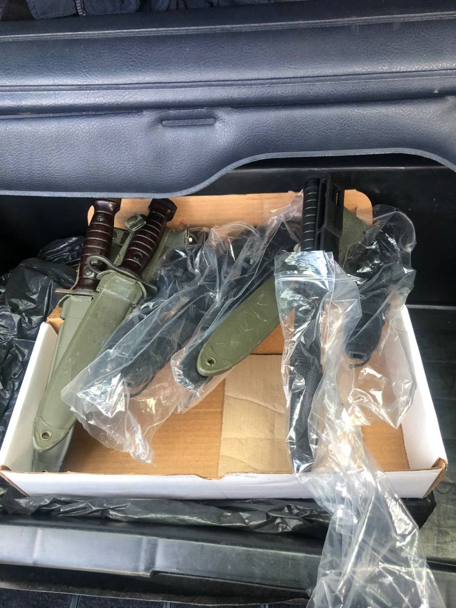 Три вживаних та п'ять нових ножів знаходились в картонній коробці на задньому сидінні автомобіля. Їх виявили під час проведення повного митного огляду транспортного засобу, який в'їжджав "зеленим коридором".