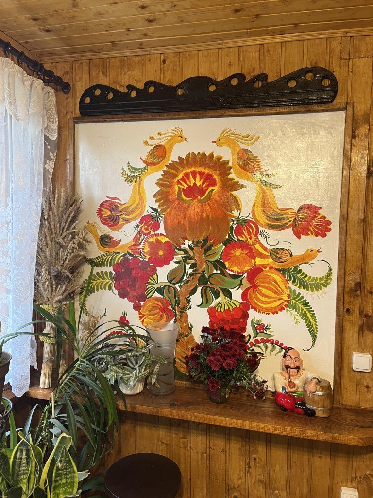 Майстри пензля на чолі із наставницею Наталією Карпатою минулого року до річниці Дня Незалежності України розмалювали тут зупинку. Свою творчу уяву художниці втілили на стінах споруди, яка тепер милує око не лише місцевих жителів. За основу композиції використали традиційний рослинний орнамент: жовтогарячі соняшники, кетяги калини, цибульки тощо. Візерунковий ансамбль виконали гумовими фарбами.