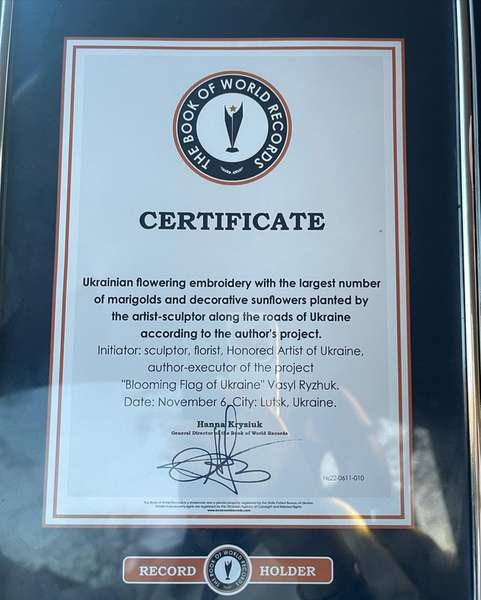 Волинянин Василь Рижук встановив світовий рекорд у номінації «Українська квітуча вишиванка з найбільшою кількістю чорнобривців та декоративних соняшників, висаджених художником-скульптором вздовж доріг України за авторським проєктом».