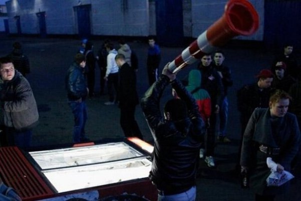 Після цього радикально налаштована частина учасників акції ‒ понад 1000 людей ‒ під проводом націоналістів та футбольних фанатів розбила вітрини в торговому центрі «Бірюза», а потім рушила до овочевої бази, де працюють мігранти.