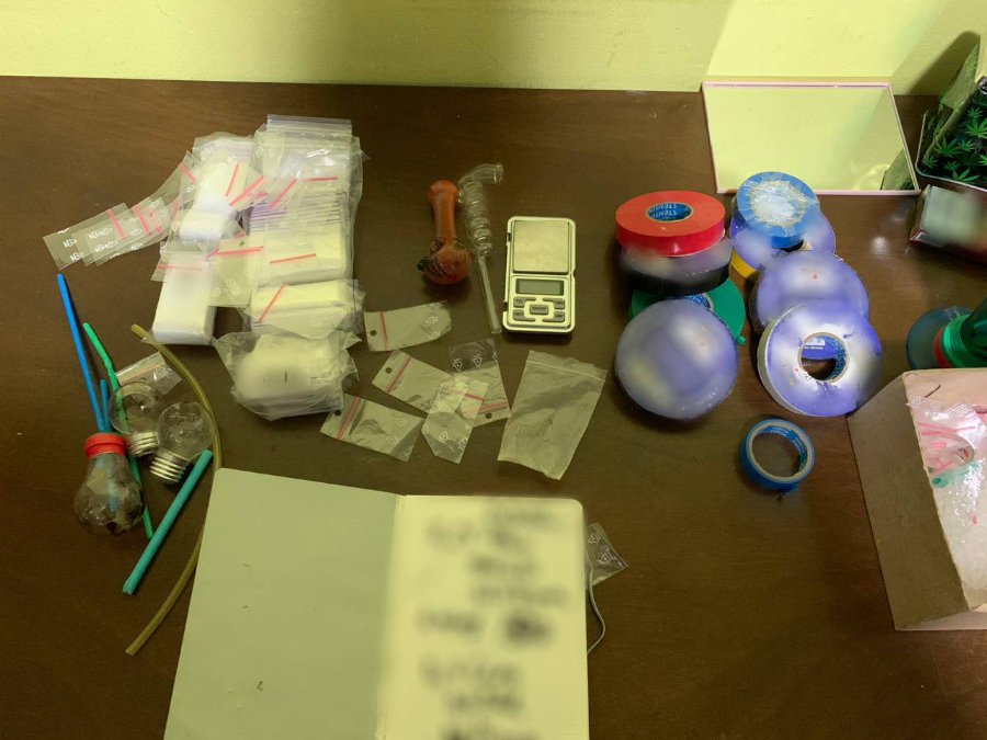 За місцем тимчасового проживання чоловіка проведено невідкладний обшук, вилучено пакетики з нашаруванням невідомої речовини, зіп-пакети, ізоляційні стрічки різних кольорів, саморобні пристрої для вживання наркотиків, чорнові записи.