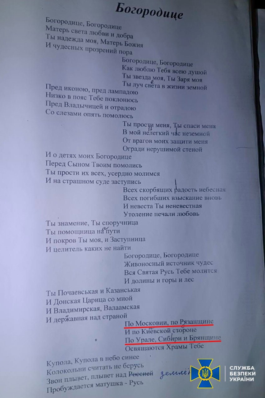 Також під час заходів СБУ знайшла тексти проросійських пісень, якими прославляли «русскую землю» і закликали до «пробудження матушки-Руси».