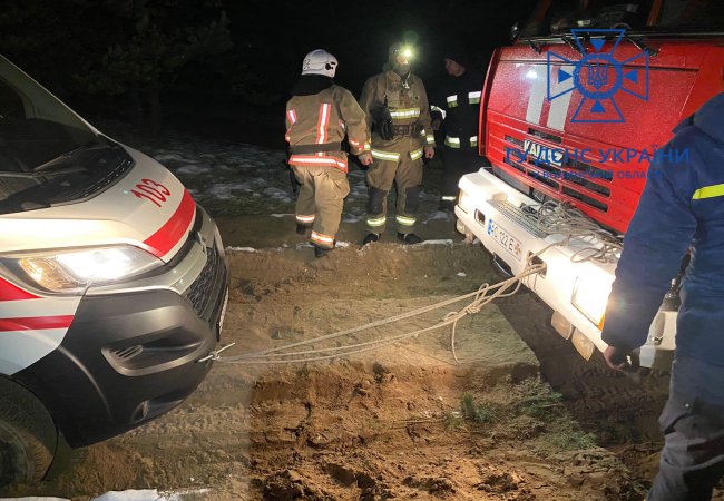 Автомобіль служби 103 через складні погодні умови не зміг проїхати ґрунтовою дорогою Любешів-Лахвичі, отож рятувальники відбуксирувати транспортний засіб пожежною автоцистерною.