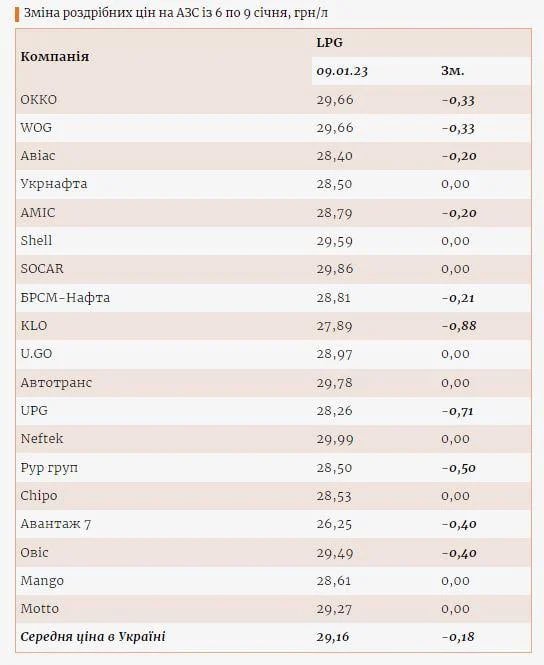 В Україні середня ціна на скраплений газ за вихідні з 6 по 9 січня в мережах АЗС зменшилася на 18 копійок, до 29,16 грн/л.