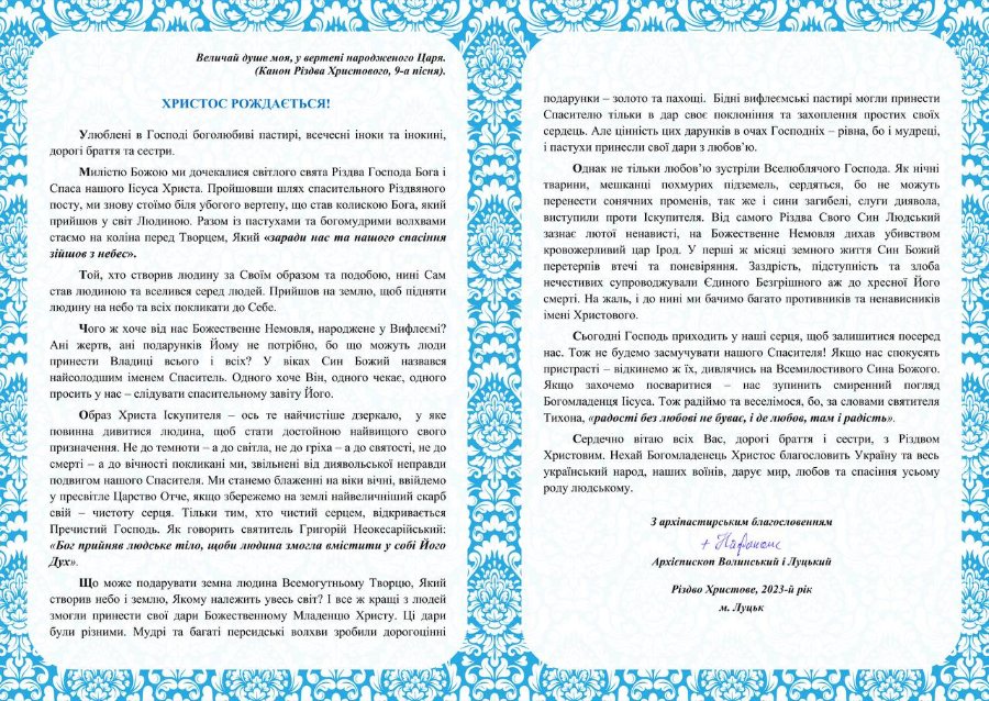 «Різдво Христове 2023 року ми зустрічаємо не лише з радістю, але й з тривогою в душі. Радісна новина – бо Різдво Христове приходить у наші оселі й парафії, але повномасштабна кровопролитна війна московії проти України, яка триває з 2014-го року, тривожить наші серця.