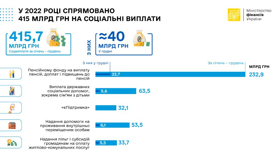 За 2022 ріку на соціальні виплати з державного бюджету України спрямовано 415,7 млрд гривень, зокрема у грудні майже 40 млрд гривень.