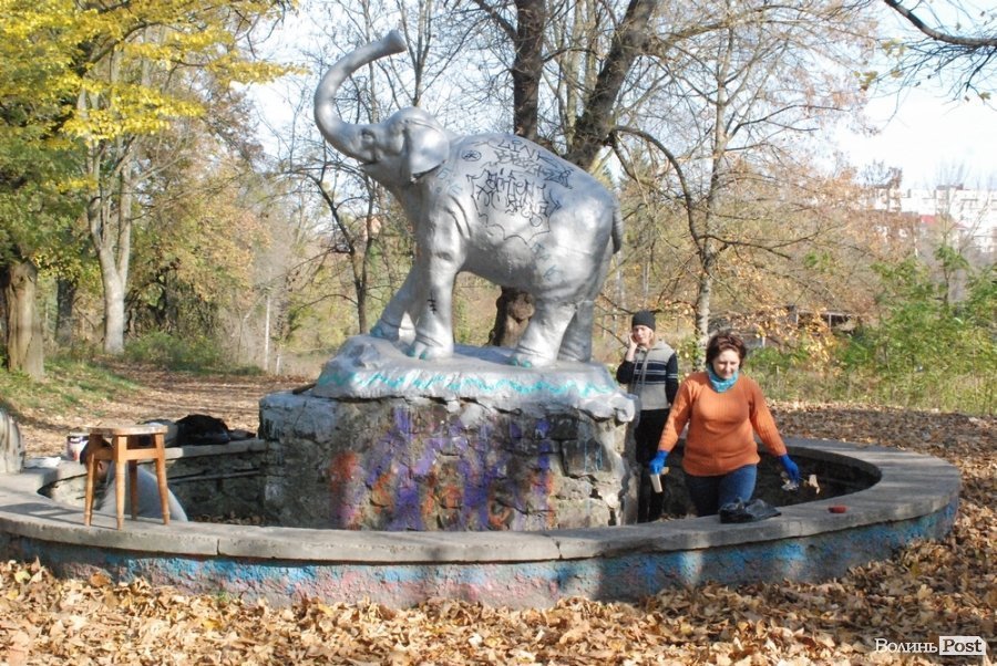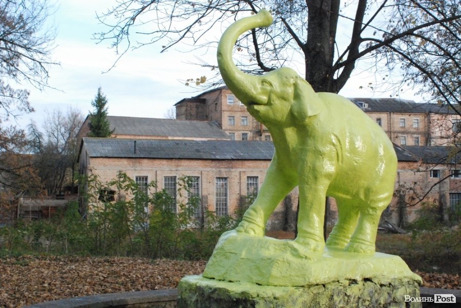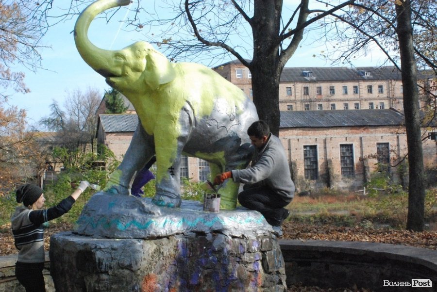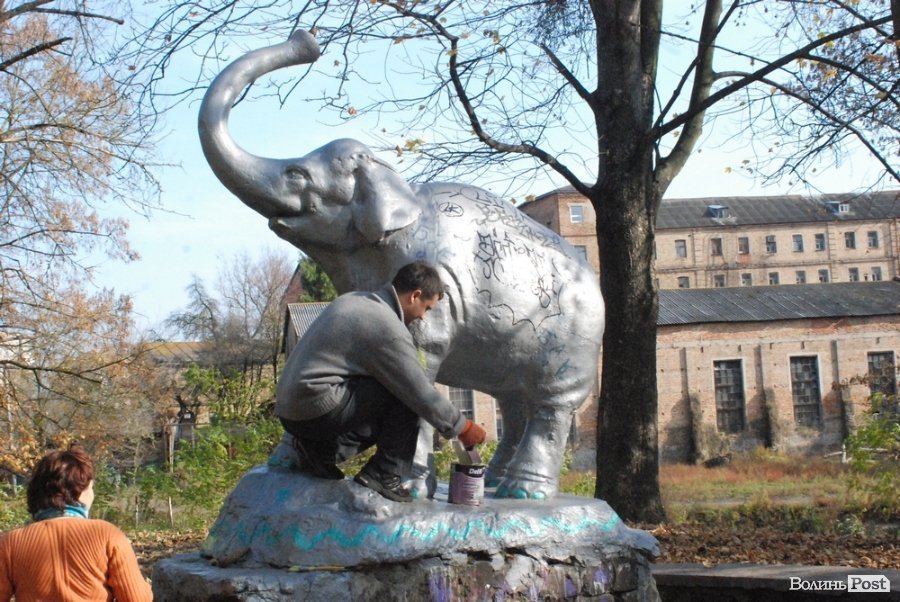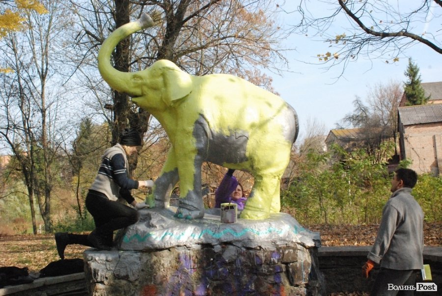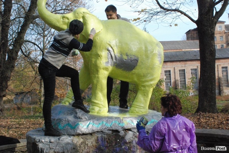 Троє мешканців Луцька перефарбували фігуру слоника, яка розташована за Палацом учнівської молоді, в оливковий колір.