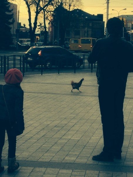 Учасники групи в коментарях до допису цікавилися, звідки в центрі міста взялася курка. Олександр Купрійчук припустив, що вона втекла з Центрального ринку, а Владко Вольфрамович написав: "з чікен хат вирвалась.)".