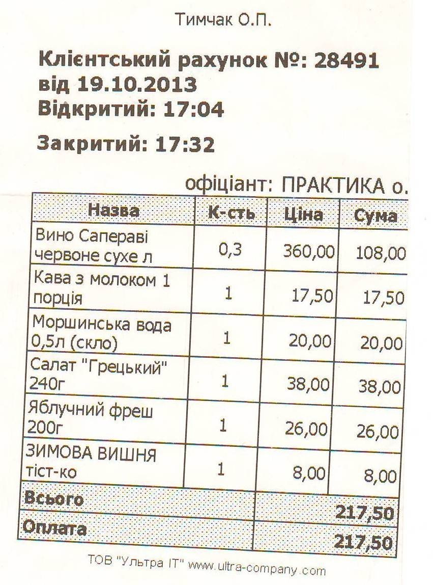 Судіть самі: вино «Сапераві» 300 г – 108 грн, кава з молоком – 17,50 грн, «Моршинська» 0.5 л (скло) – 20 грн, салат «Грецький» - 38 грн, яблучний фреш – 26 грн, тістечко «Зимова вишня» - 8 грн. Всього – 217,50грн.