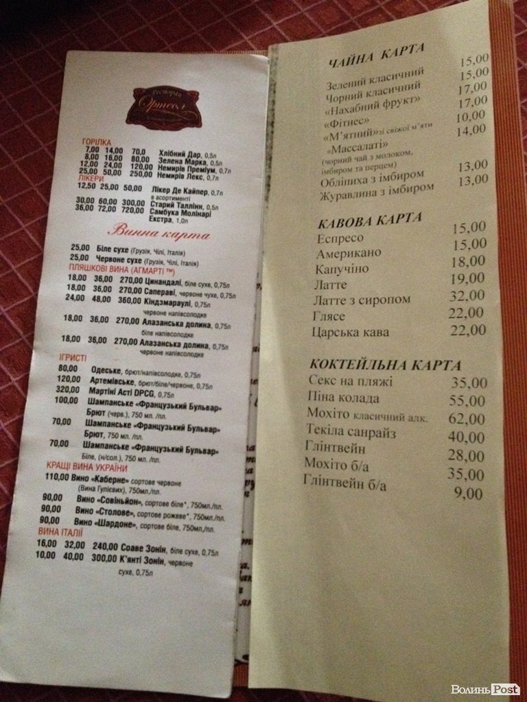 По-третє, коли нестимете гостям меню, серед сторінок по-сирітськи притуліть жовтуватий листочок-вставочку (може, на друк не вистачило коштів?).