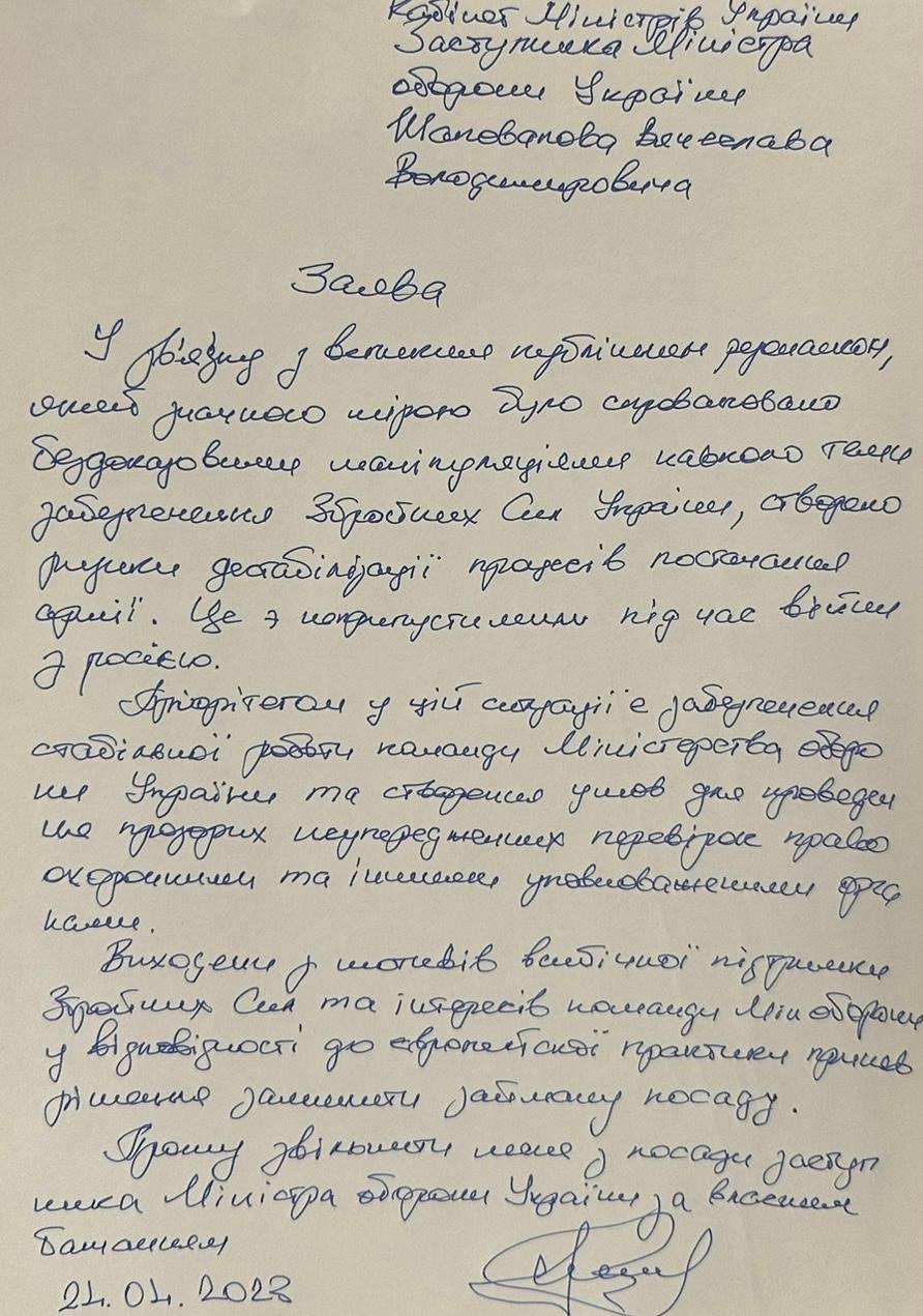 "В’ячеслав Шаповалов, який відповідав за тилове забезпечення ЗСУ, попросив звільнити його, щоб не створювати загрози для стабільного забезпечення Збройних Сил України внаслідок кампанії звинувачень, пов’язаних з закупкою послуг харчування.