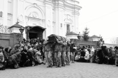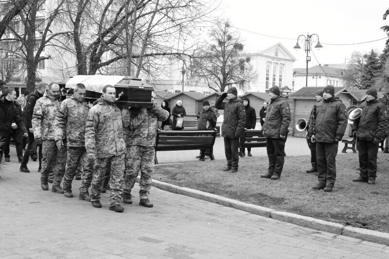 Після богослужіння домовини з тілами Героїв під звуки дзвонів і солдатської сурми пронесли Театральним майданом. Біля фотостенду “Герої Небесної Сотні – Загинули за єдність України” скорботна процесія зупинилася і виконала Державний Гімн.