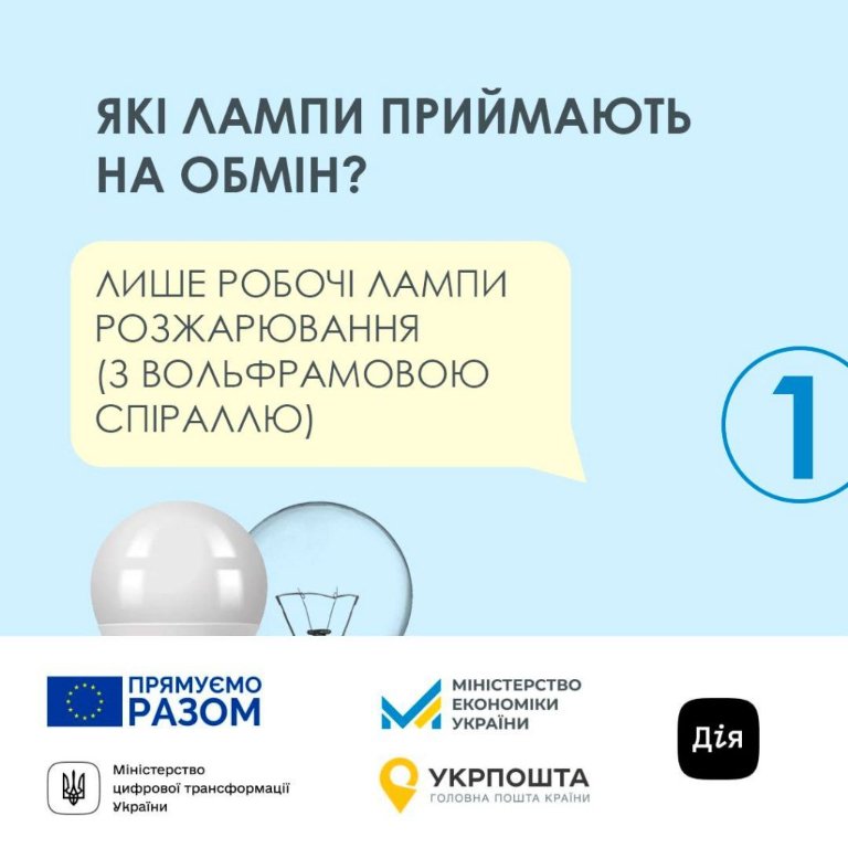 З 30 січня волиняни можуть безплатно обміняти п’ять ламп розжарювання на таку ж кількість LED-ламп. Зробити це можна у будь-якому відділенні «Укрпошти». Проект всеукраїнський і реалізується за підтримки міністерств економіки, цифрової трансформації, цифрового застосунку «Дія» та представництва Європейського Союзу.